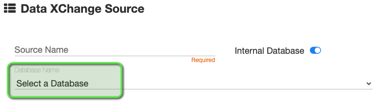 Alternately, if you are doing an internal lookup (select the Internal Database toggle). This option allows a Data XChange source to look into the current or a different GlobalSearch database without any special configuration, connection strings, or users.