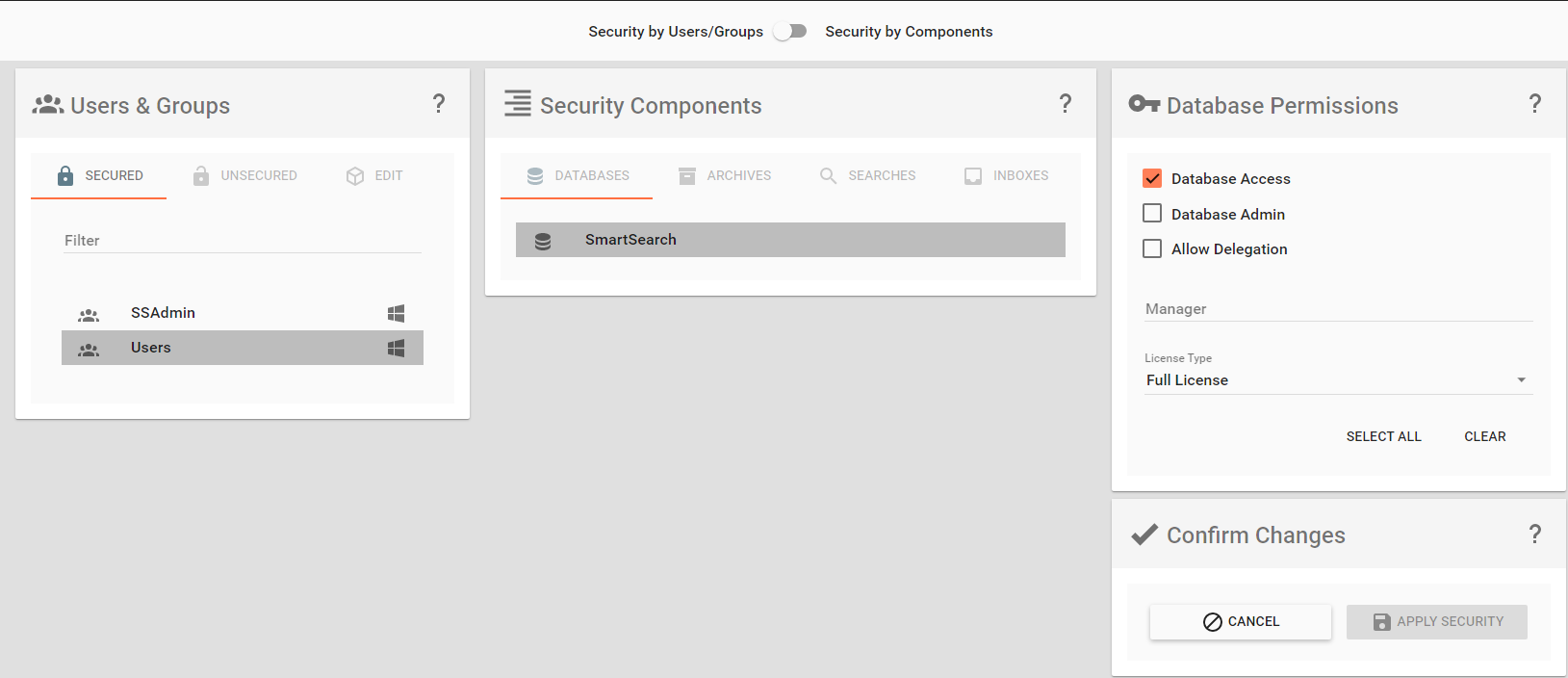 Before users or groups can access GlobalSearch, they must first be granted access to a database. Before they can be granted permissions to an Archive, they must first be granted access to the database where the Archive is located. Each database within GlobalSearch has its own set of user and group permissions.