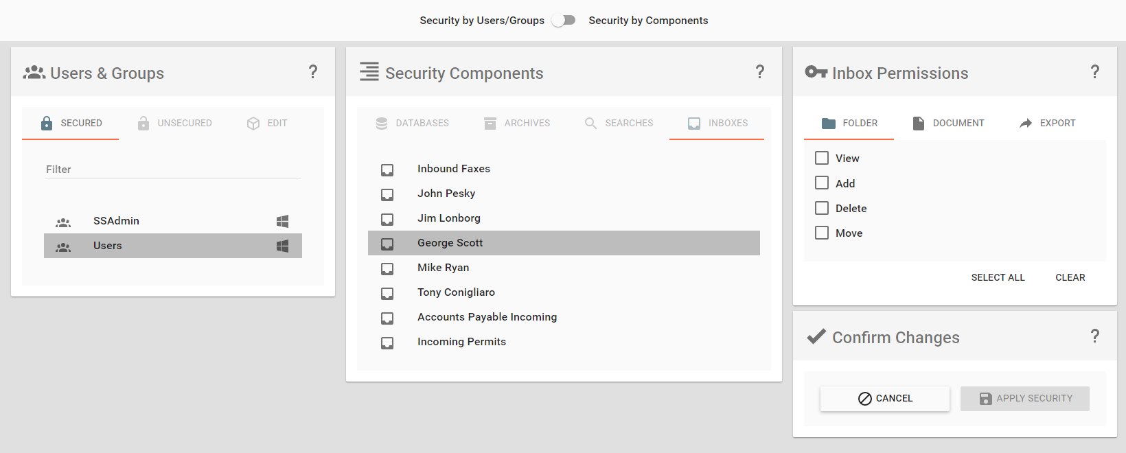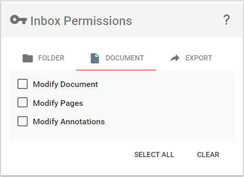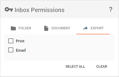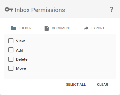 In the Inbox Permissions panel, click one of the tabs and then select the appropriate permissions individually or click Select All. The choices include Folder, Document, and Export.