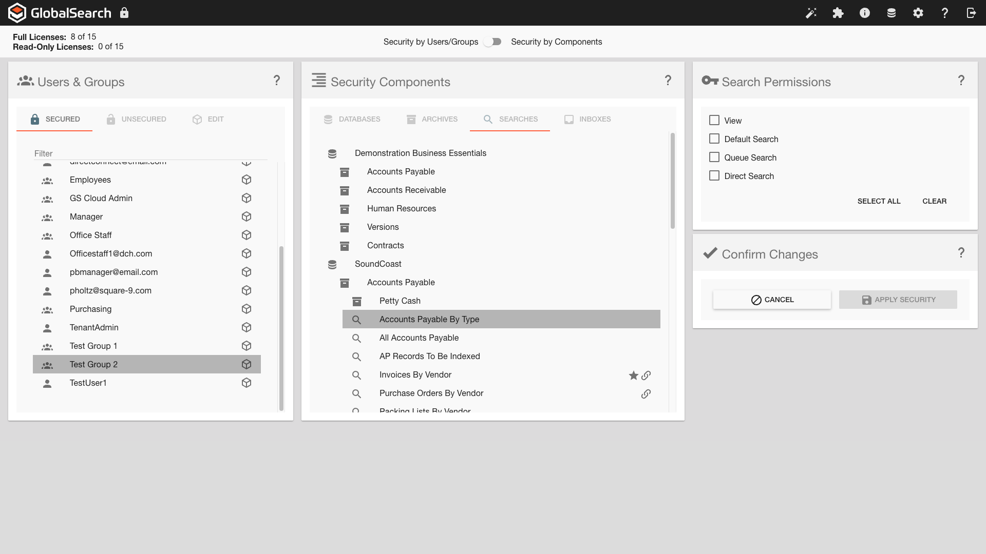 All documents in an Archive are located and viewed using a Search. As with all other security options, a user must be added to the Secured Users and Groups list prior to assigning database permissions. To set Search permissions, from the list in the Users & Groups section, click to select one or more users or groups of users.