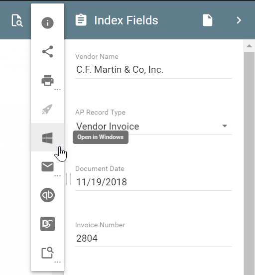 Open in Windows appears in the Document Viewer Actions menu when the Launch extension is enabled and a document's file type does not have a corresponding entry in the Launch Table.