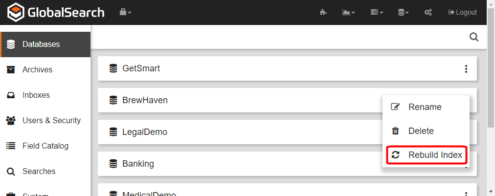 ssFieldstable in SQL, click the More Options () icon in the selected database bar. - Click Rebuild Index.