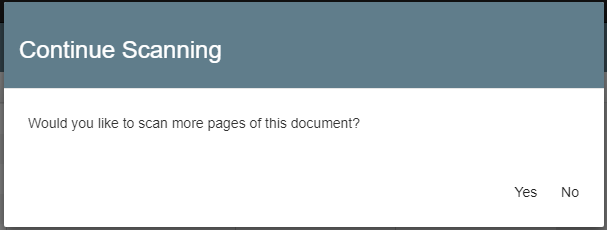Put more pages into the document feeder and click Yes to add more pages to the current document. Click No to accept the scanned pages as the complete document and move to the next step.