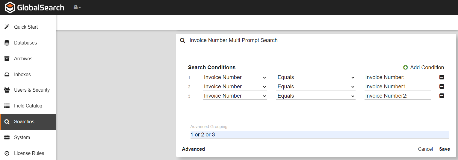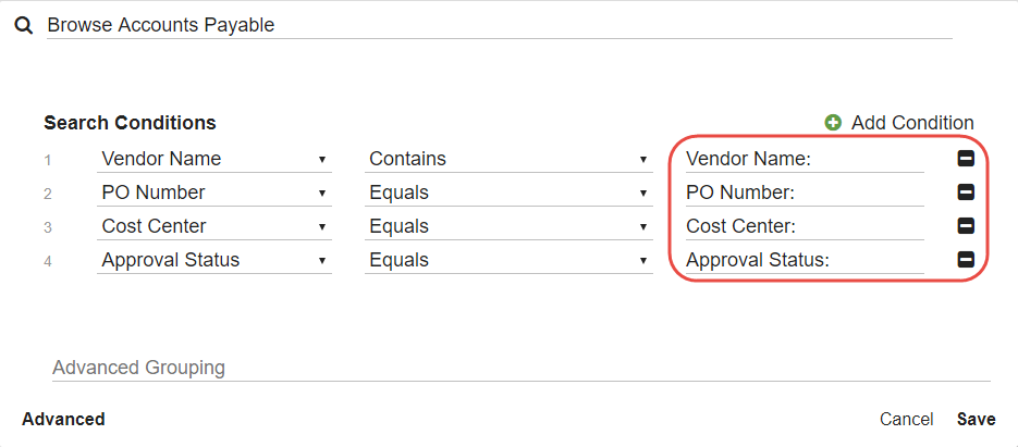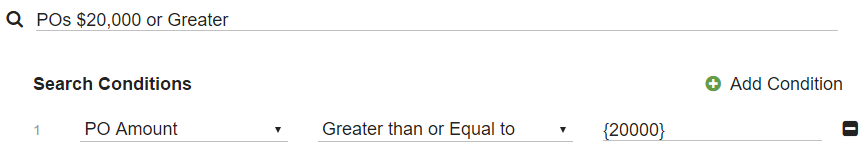 - If using an Equals condition, consider putting “Equals” at the end of the prompt, such as “PO Number Equals.”