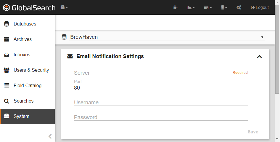 Email notifications are used to alert users that an update has been made to an Archive and Workflow. To send email messages, GlobalSearch needs to know the configuration details of your email server.