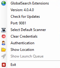Right-click on the Extensions () icon in your Windows® system tray to open the GlobalSearch Extensions tray menu, with useful information and quick access to the Extensions Manager interface: