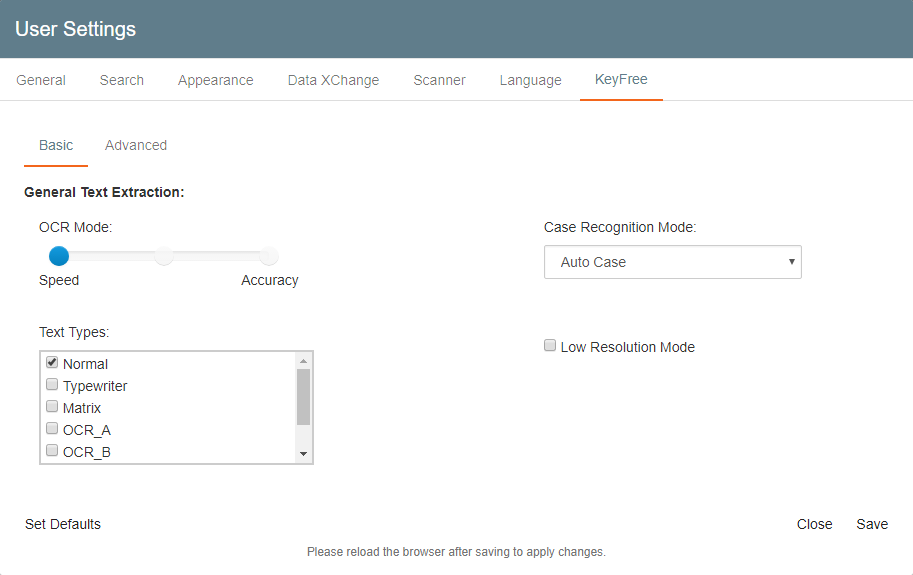 KeyFree Indexing allows you to enter indexing data without having to type it in. It is done using OCR (optical character recognition) technology. To get the best OCR results, you can finesse the settings for each document or document type to your user preferences. The better the OCR results, the less manual data correction you might need. For details on optimizing KeyFree OCR settings, please refer to the KeyFree OCR Settings page.