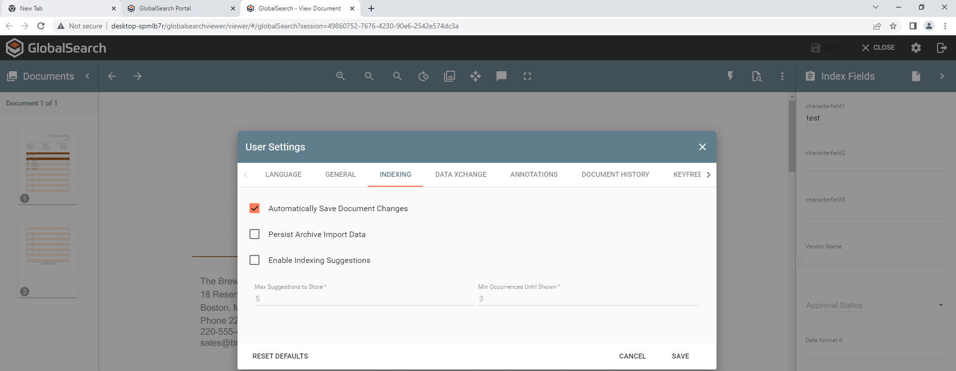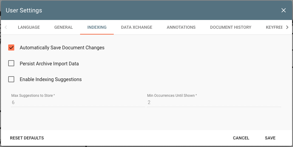 When selected, GlobalSearch will cache the last data entered in an archive. This is helpful when indexing multiple documents to the same archive with similar data. Consider indexing a new employee’s HR file. After scanning and indexing one document to the HR archive, it may be desirable for that same data to automatically be present for the next scan. In this way, minor changes (like changing the document type) can be made without rekeying everything.Enable Indexing Suggestions