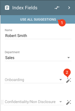 In the example above, clicking Use All Suggestions (1) will apply all available suggestions. Clicking the magic wand (2) will accept only that specific field’s suggestion.