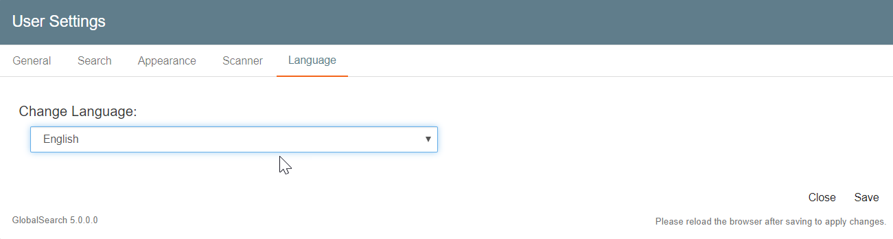 The web client has built-in On Demand Localization to view GlobalSearch with different languages. Use Change Language to change from the default language (English) to Dutch, French, German, Italian, Portuguese, Romanian, or Spanish. Localization can also be extended to other languages with a fully documented translation kit. Note that this will change the language of buttons and toolbar icons, but not the language in which any databases, Archives, Index Field, or documents you or your system administrator have created. They remain in the language in which they were created.