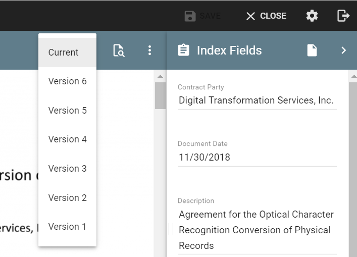 Versioning is a feature the must be enabled when an Archive is first created. Existing Archives can not be retroactively version controlled.In a Versioning-enabled Archive, each time edits of any kind are saved to a document, the previous document state is preserved and a new version is created. The latest version of a record displays in the Search Results Grid View, with a Document column to indicate what version number the current document is on. Previous versions can be restricted or can be made accessible, depending on organizational preference.