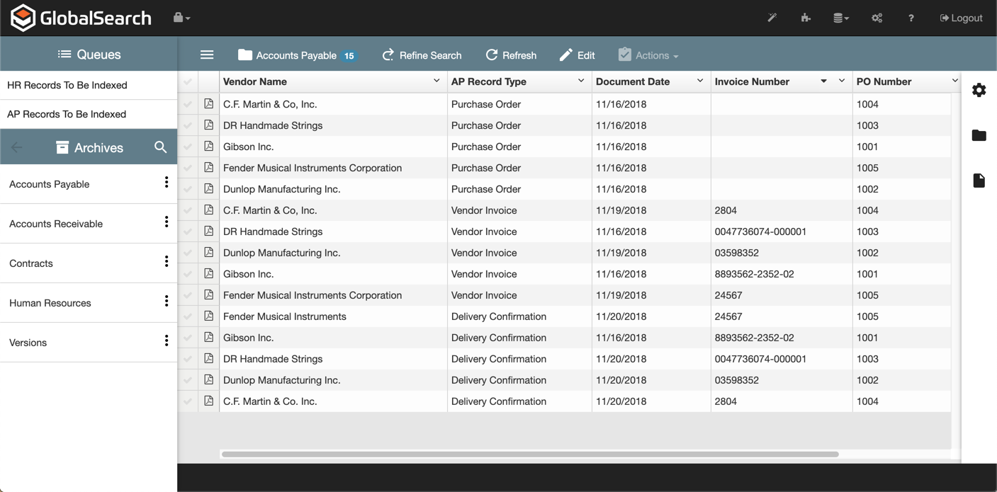 When you run a Search, the results appear in the Search Results Pane. The record of any documents that meet your searching requirements and permissions restrictions will be displayed here. The pane has a Documents Menu Bar to perform a variety of document actions, a Search Results Document List containing all documents that meet your search requirements, and a Page Navigation Bar to control navigating through your search results.