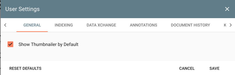 Images of document pages are displayed in the Thumbnails panel, located on the left-hand side of the Document Viewer. This is particularly useful for navigation, if there are multiple pages to a document or when editing the pages of a document. Document thumbnails are enabled by default but may be turned off by the user if preferred by unchecking the box under General Settings on the Document View User Settings