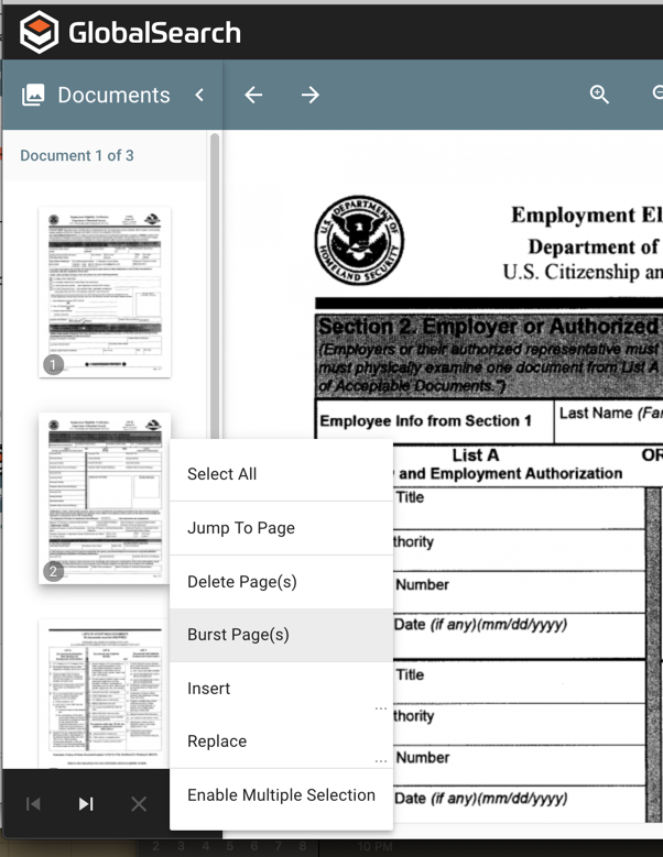Delete Page - Select a thumbnail or multiple thumbnails of a document and click delete page to remove them from the record.