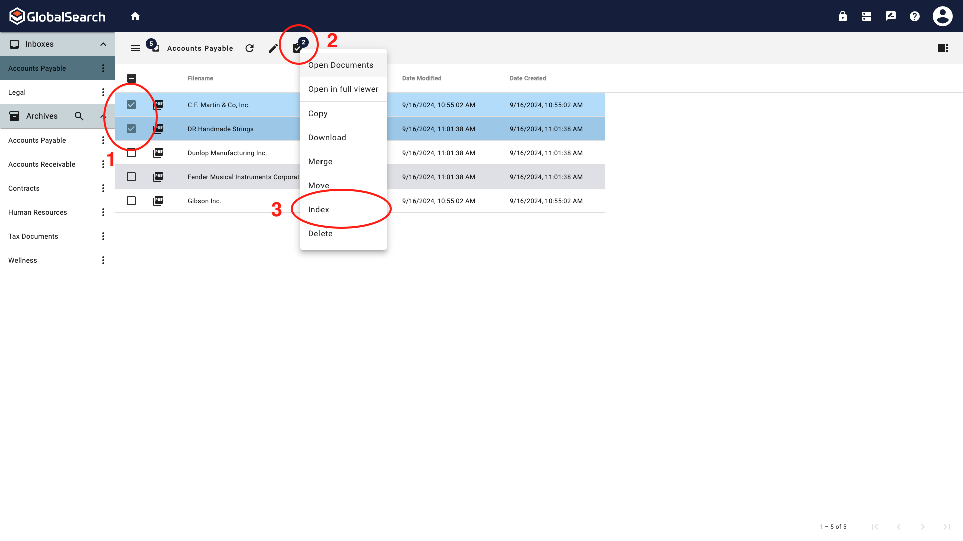 Select one or more files from an Inbox and choose Index from the Action menu.