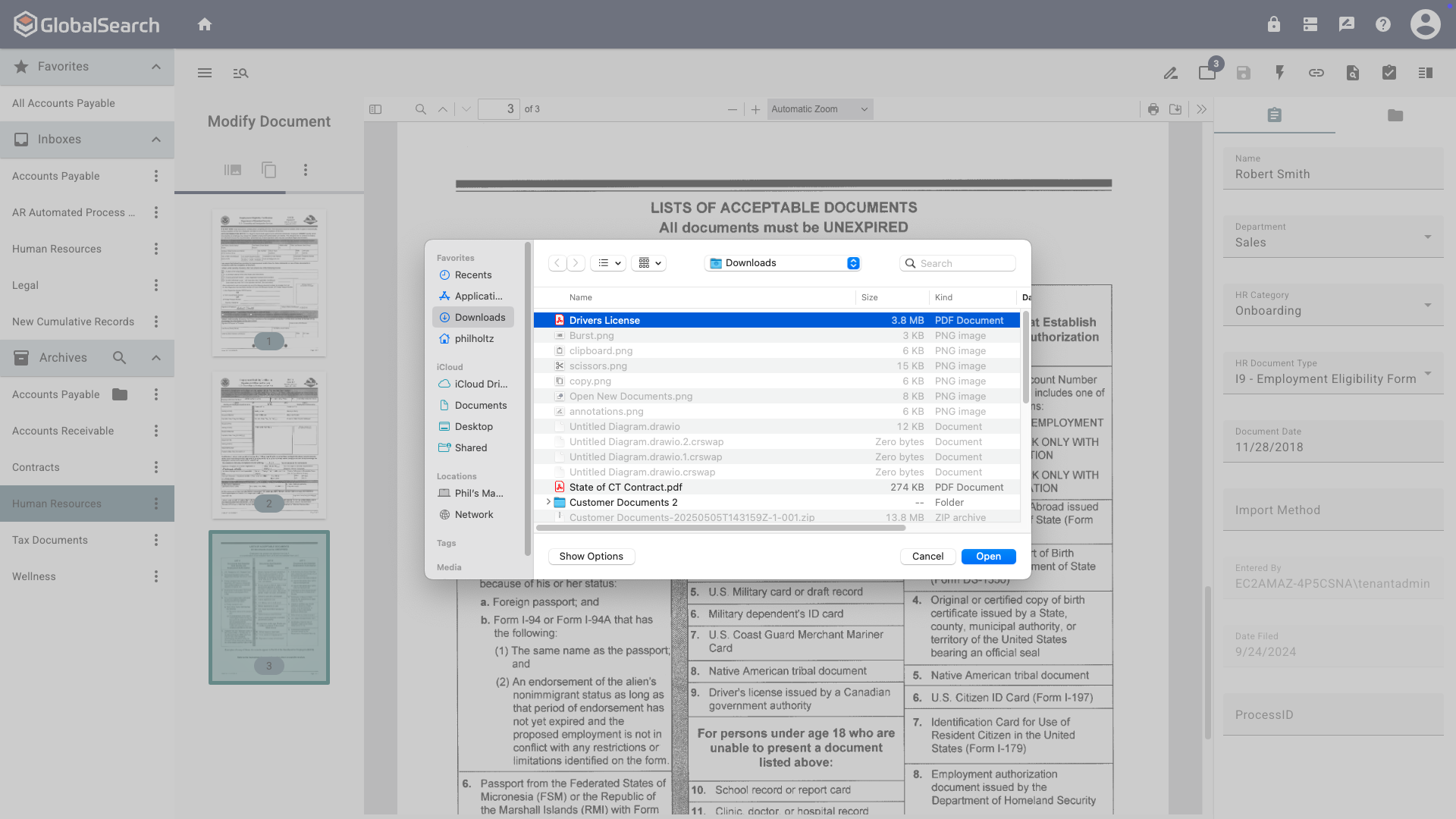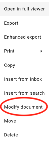 When Modify Document is selected from the Actions menu, images of document pages are displayed in the Modify Document panel, located to the left-hand side of the Document Viewer. This is particularly useful for navigation, if there are multiple pages to a document or when editing the pages of a document.