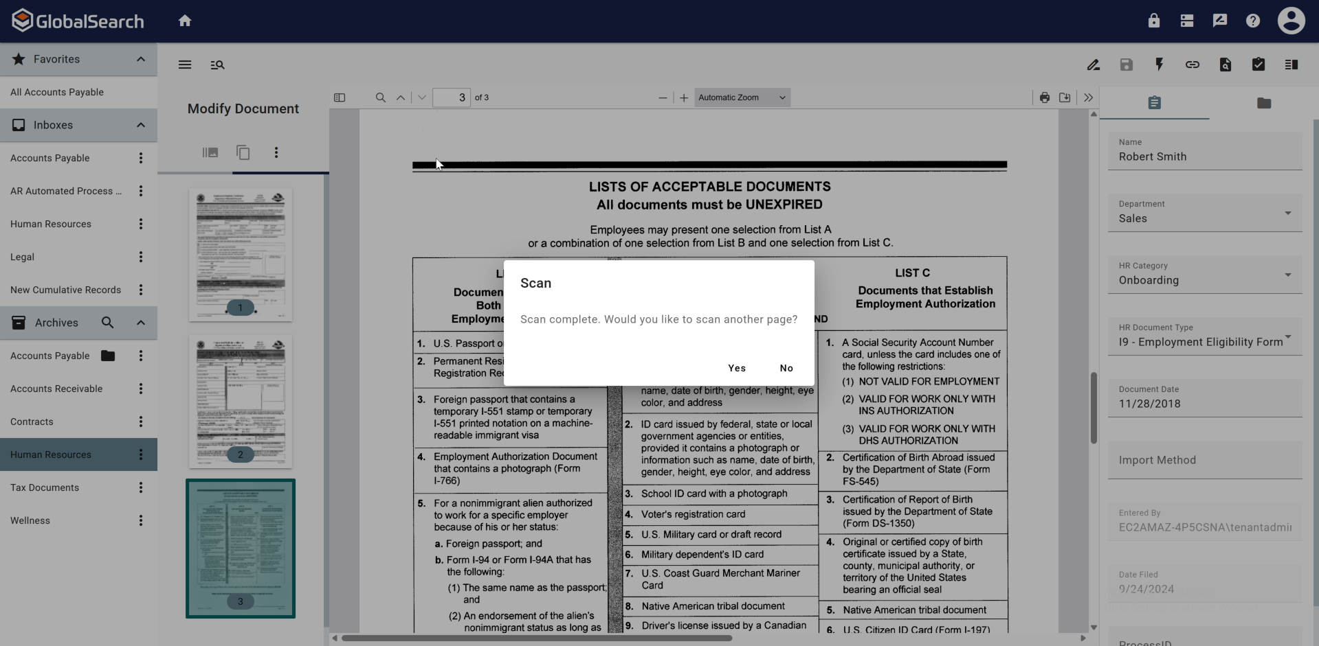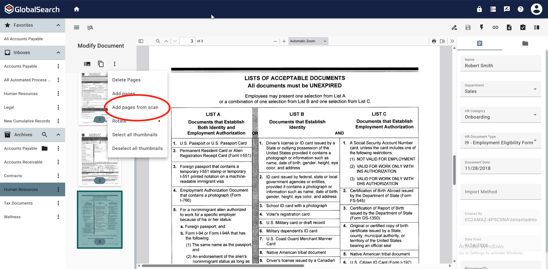 To Add Pages from Scan you must have a desktop scanner connected and GlobalSearch Extensions installed.