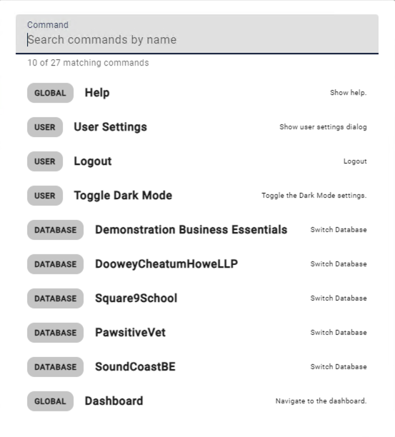 To expand the powers of keyboard navigation and feature location beyond what hotkeys can support, this feature provides a keyboard invokable command palette that will allow for a fuzzy search of available registered commands and a number of components in the UI.