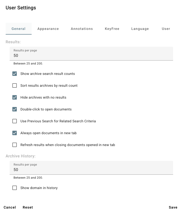 Results per page - Sets the number of historical actions that appear on each page in the Document History tab of the right sidebar. Can be set between 25 and 200.