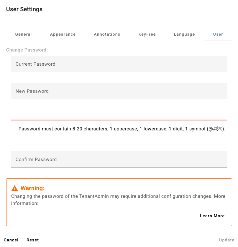 If you are logged in as a Square 9 User, you will see a tab, called “User” in the Settings window. From here you may change your Square 9 User password. Default passwords must be between 8 and 20 characters in length, including one upper case character, one lowercase character, one number, and one symbol (@#$%).