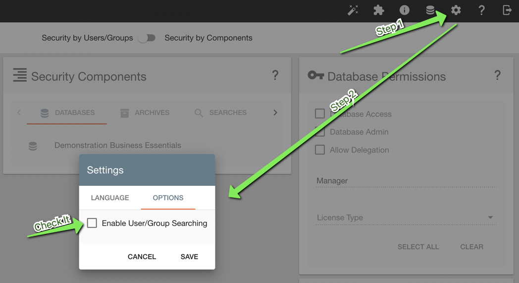From the second tab “Options“ check the box for “Enable User/Group Searching“