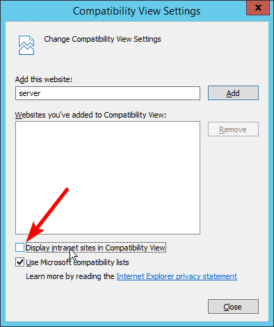 In the settings window that appears uncheck the option Display intranet sites in Compatibility View