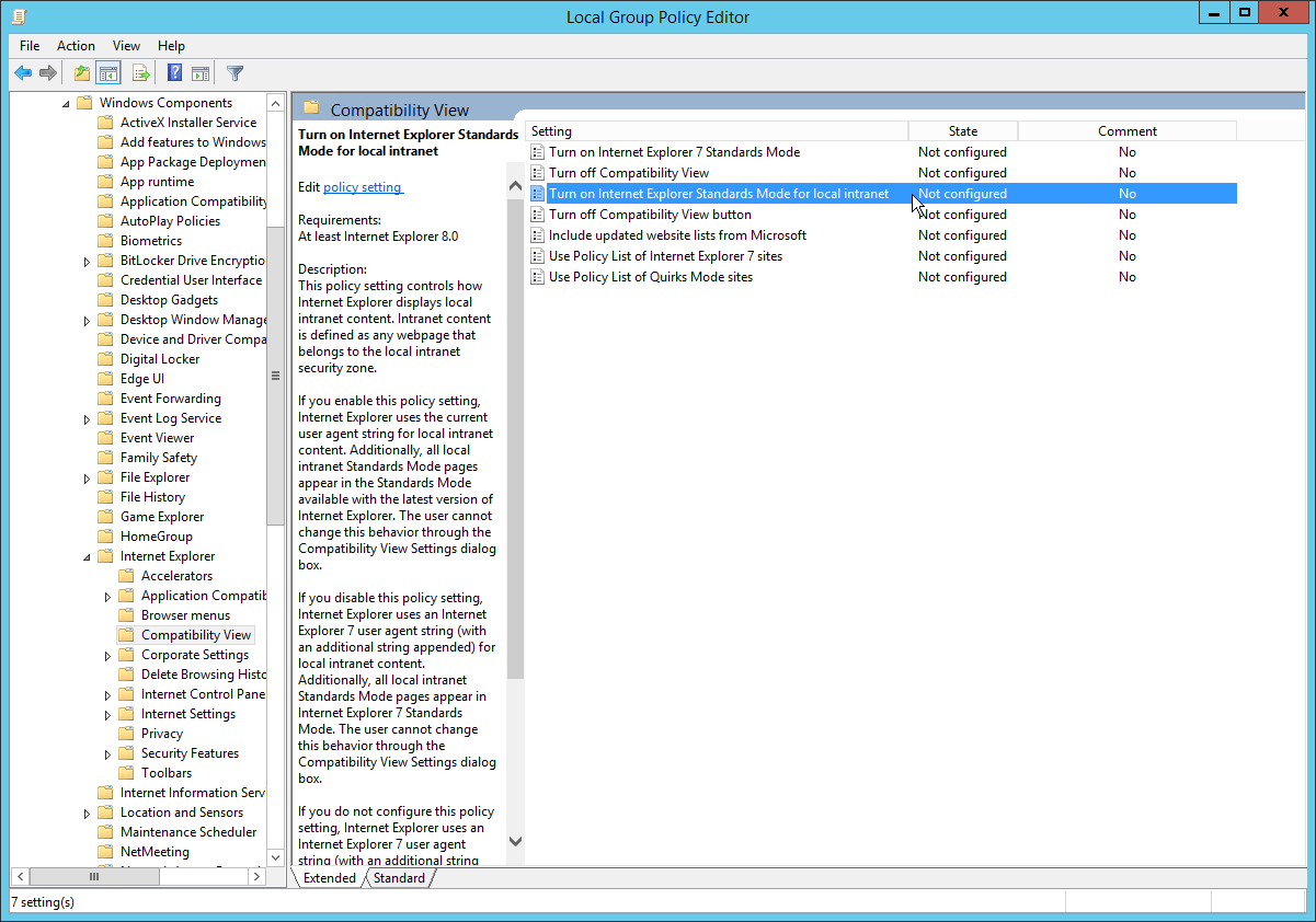 Computer Configuration → Administrative Templates → Windows Components → Internet Explorer → Compatibility View
