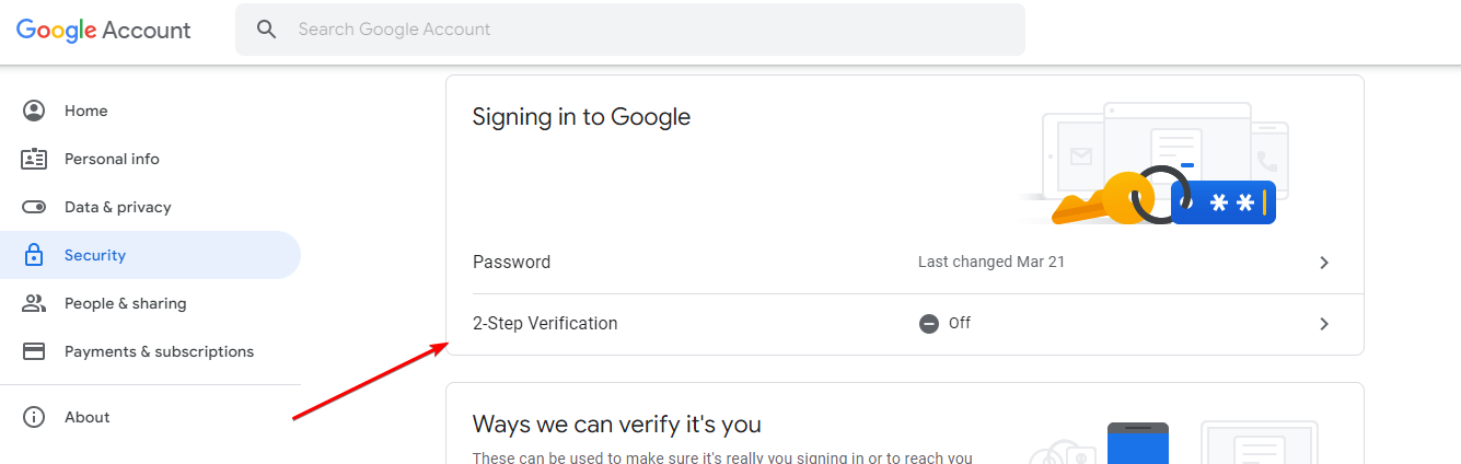 Scroll down to “Signing in to Google” and click “2-Step Verification”.