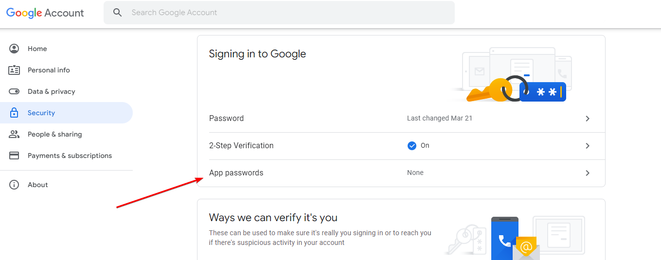 Scroll down to “Signing in to Google” and click “App passwords”.