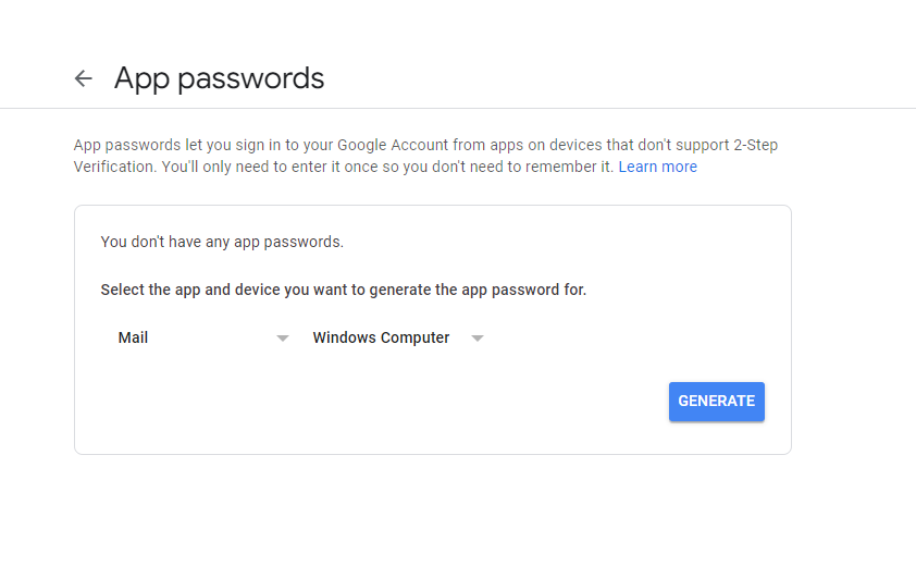 Now that MFA has been enabled, you can provision app passwords for your Google Account.