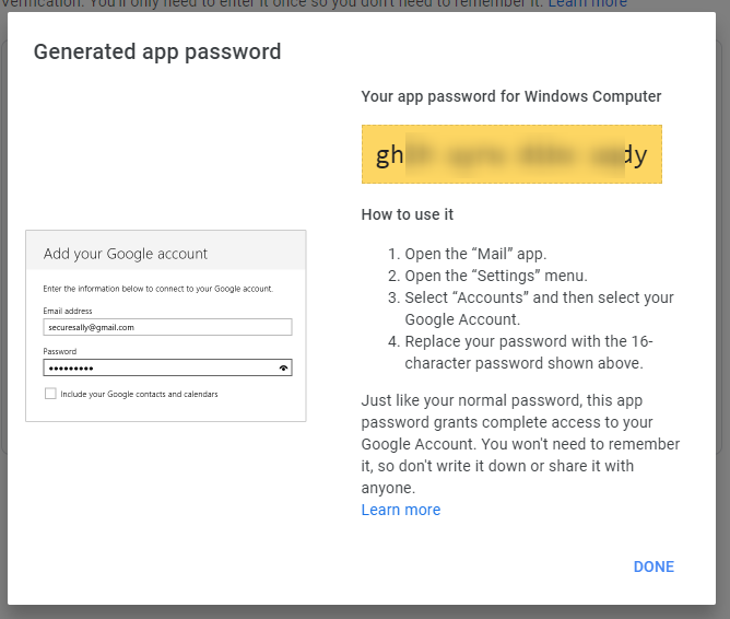 Full documentation for configuring an app password with GMail is available here: https://support.google.com/accounts/answer/185833?hl=en