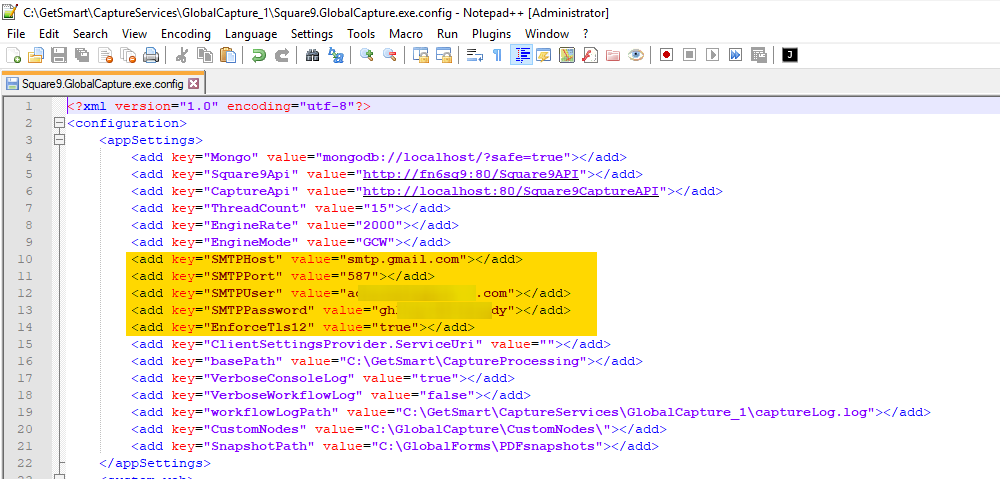 Locate the file “Square9.GlobalCapture.exe.config” and open it in a plain text editor, such as Notepad, Notepad++, or VSCode.