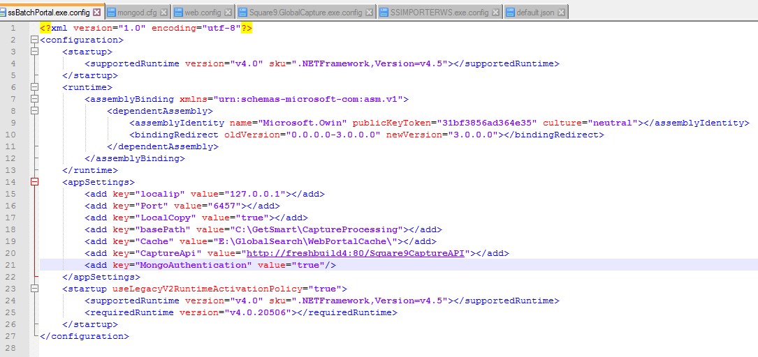 Save the file and restart the MongoDB service. Also restart the ssBatchPortal, GlobalCapture_1, S9GlobalAction (or GlobalAction_1 for version 2.2.0.0 and higher), and GlobalForms services.