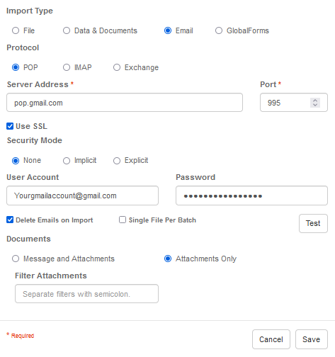Setup a new email account for importing invoices from the Transform AI Form.