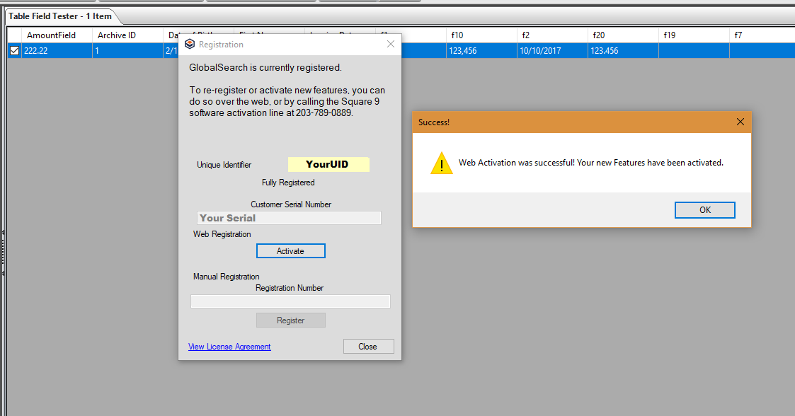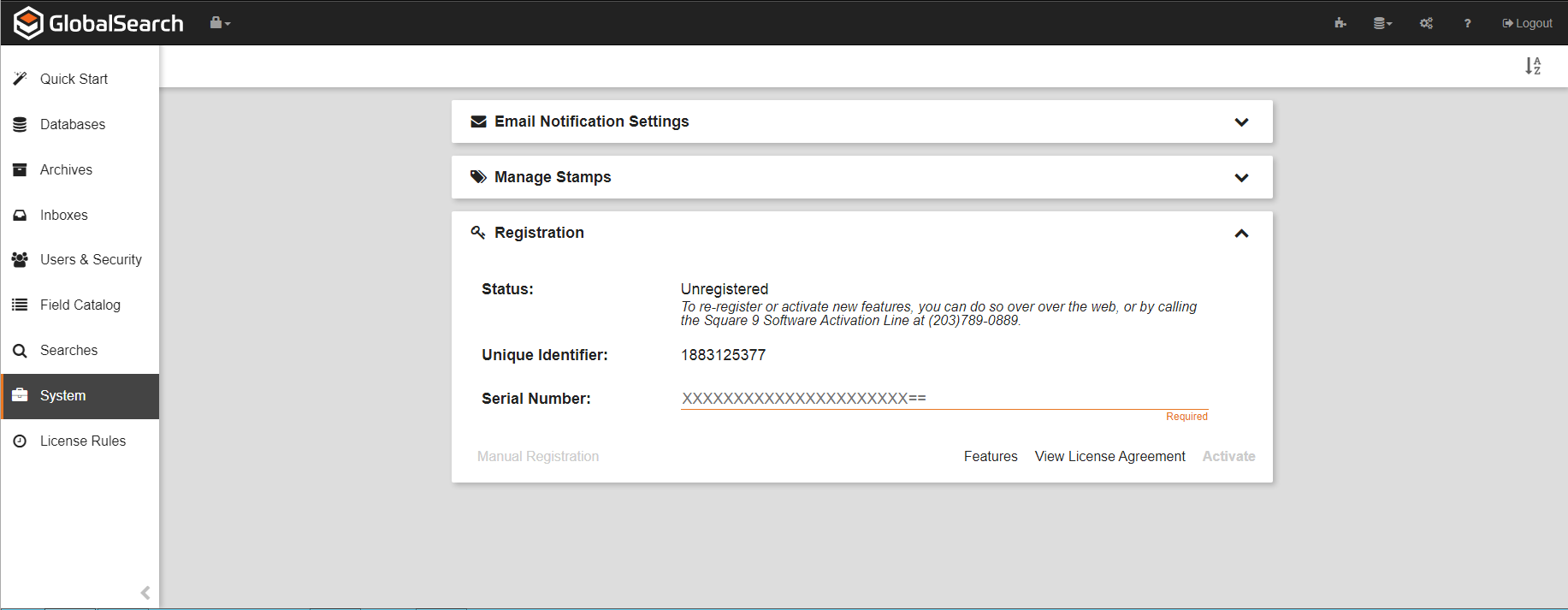 All purchased copies of GlobalSearch will have to register their software with Square 9's Fulfillment department. The features your implementation is licensed for are stored in a Features file and cross-checked against our licensing database. Your Features file will be initially provided by Square9 Fulfillment. Any additional changes to your feature licensing can be pulled down by hitting "Activate" in the GlobalSearch registration window. Additionally, if you've lost or misplaced your ssFeatures file, Square9 Support can provide you with a copy. Please note, the user running the application pool will be performing the update to the .lic file, and will need full access to the inetpub directory to do so. Once the file is updated, newly licensed features will be available effective immediately.
