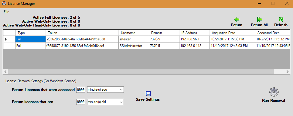 The License Manager displays all active sessions, when they were initiated and when they were last active. Additionally, buttons at the top of the UI allow you to return a single token or all tokens, as well as refresh the window to monitor changes. Additionally, it displays the total amount of seat licenses available to users. The types of licenses are as follows: