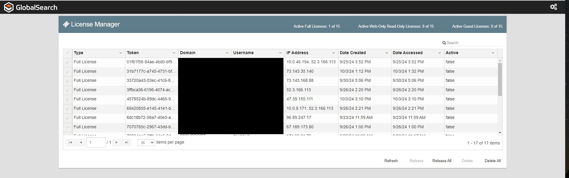 GlobalSearch licensing is monitored by the ssLicenseClean service on the server, which should be running as your application pool user (usually SSAdministrator.) This service is responsible for maintaining active licenses and returning inactive licenses. There is also the License Manager, which can be accessed via the GlobalSearch Web URL (for GlobalSearch 5.0 and up), or by accessing the ssLicenseClean.exe within the server's GetSmart directory. The GlobalSearch License Manager is a utility, hat will remove Token License Files either manually or through a predetermined automatic removal setting. Using the License Manager’s user interface, an admin can force the removal of Token License Files displayed in the grid.