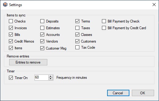 To configure QuickSync to run at a set time automatically in the background, select Timer On and enter the number of minutes in the Frequency in minutes text box.