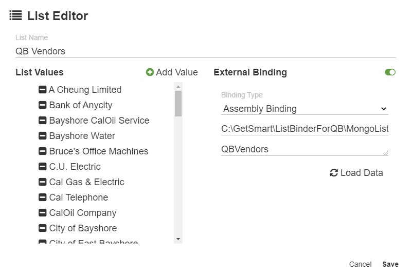 The Assembly Bound List for QuickBooks is distributed as a dynamic link library (DLL) named MongoListBinder.dll. In addition to the assembly DLL file itself, an assembly bound list is also dependent on an XML configuration file that is user defined. Each assembly bound Field List in GlobalSearch will specify a different configuration file that will be used to configure the connector for that List.
