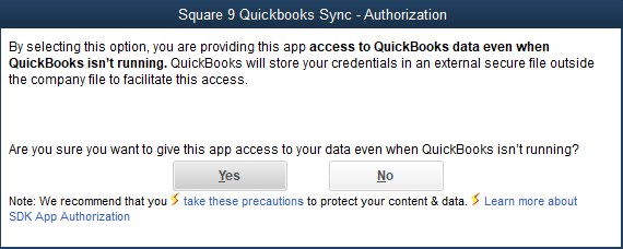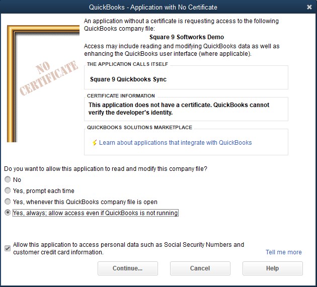 Under “Do you want to allow this application to read and modify this company file?” select “Yes, always; allow access even if QuickBooks is not running”.