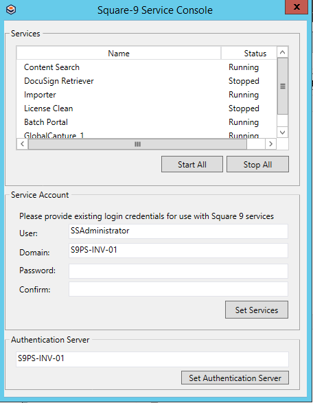 When Service Console loads, enter User, Domain, Password and confirm your password, click Set Services. Additionally, set your Authentication Service, in domain installations, this is the domain’s NETBIOS name, in Workgroup installs, this is the name of the server.
