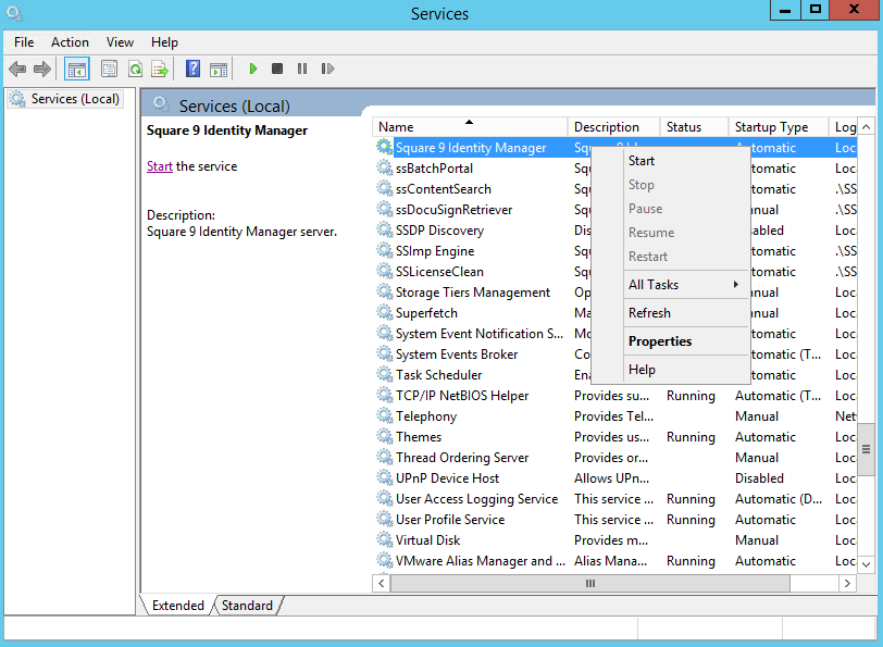 Following running service console, open Services and start “Square 9 Identity Manager”