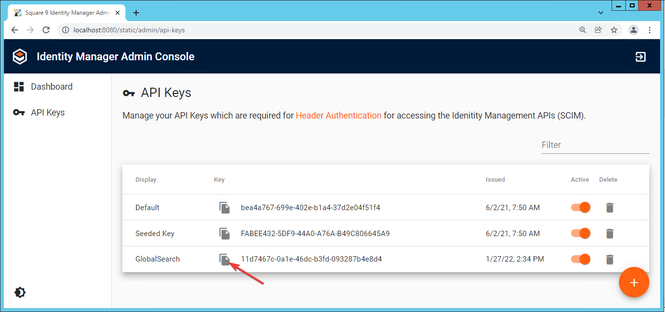 Square 9 interacts with identity manager with a uniquely generated API Key. This key is generated from within the Square 9 Identity Manager website, to create a key: