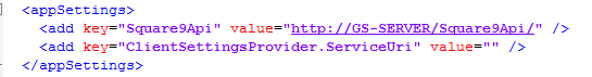 - In the <appSettings> section, make sure there is a key for the Square9API. If there is, make sure that the value is accurate. If the key is missing, you will need to add it manually by typing in the text.