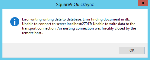 When initiating a sync, you receive an error “Error writing writing data to database: Error finding document in db: Unable to write data to the transport connection: An existing connection was forcibly closed by the remote host..”