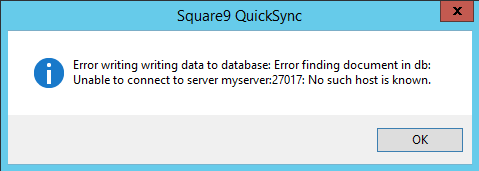 Make sure that the reference to MongoDB is valid in the QuickSync config file. In the above example, “myserver” is not a valid server name.